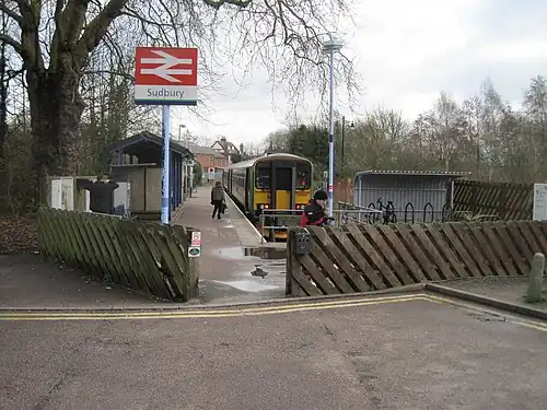 Sudbury railway station is the northern terminus of the Gainsborough Line, a branch off the Great Eastern Main Line in the East of England, serving the town of Sudbury, Suffolk. It is 11 miles 67 chains (19.05 km) down the line from the southern terminus of Marks Tey and 58 miles 32 chains (93.99 km) measured from London Liverpool Street; the preceding station on the branch is Bures. Its three-letter station code is SUY. The platform has an operational length for two-coach trains.[1]