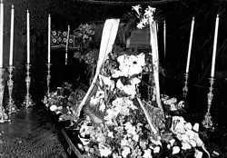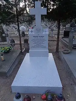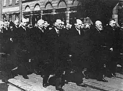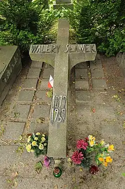 After his death, Sławek's body was displayed in his apartment until the funeral, where comrades, colleagues, and the public paid their respects.[9] The funeral took place on 5 April 1939 in Warsaw.[10] The procession, led by Canon Popławski, proceeded from the Field Cathedral of the Polish Army on Długa Street through Warsaw to the Powązki Military Cemetery. Rydz-Śmigły attended just before the service began. As the coffin was removed from the catafalque, Sławek's closest friends surrounded it, preventing Rydz-Śmigły's approach, blaming him for Sławek's death.[3] The coffin was carried by, among others, Aleksander Prystor, Janusz Jędrzejewicz, Michał Tadeusz Brzęk-Osiński, and Gen. Lucjan Żeligowski.[11] The funeral became a demonstration by Piłsudski loyalists against the Camp of National Unity. Wreaths included inscriptions such as: "To Walery Sławek – friends from PPS", "To a Friend of the Family – Aleksandra Piłsudska", and "To My Beloved Godfather – Jadwinia Piłsudska".[12]