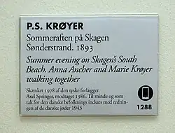 8. ^ "P.S. Krøyer 1851-1909 "Sommeraften ved Skagen Sønderstrand. Anna Ancher, t.v. og Marie Krøyer". 1893" (in Danish). Kunstnyt.dk. Retrieved 11 May 2015.