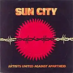 "Sun City" reached No. 38 on the Billboard Hot 100 chart in December 1985 (and #42 Cash Box).[8] Only about half of American radio stations played "Sun City". Some stations objected to the lyrics' explicit criticism of US President Ronald Reagan's policy of "constructive engagement", particularly George Clinton's and Joey Ramone's lines in the song "Our government tells us / We're doing all we can / Constructive engagement is / Ronald Reagan's plan." (Ramone also expressed open discontent and criticism towards him with the Ramones song "Bonzo Goes to Bitburg".)[9] "Sun City" was banned in apartheid South Africa itself.[10]