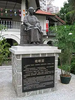 In 1905, rubber magnate Teo Eng Hock (張永福; 1872–1957) bought the villa for his mother, Tan Poh Neo, as a place of retirement and renamed it "Wan Qing Yuan".[2] In July 1905, Sun Yat Sen met Teo, Tan Chor Lam (陳楚南; 1884–1971) and Lim Nee Soon in Singapore through his close friend, Yau Lit, while en route to Europe from Japan. In April 1906, when Sun visited Singapore again, Teo offered his villa for use as the Tongmenghui's headquarters in Southeast Asia. At the villa, the Tongmenghui planned numerous uprisings and fundraising activities leading to the 1911 Xinhai Revolution, which ended imperial rule in China under the Qing dynasty. Three uprisings of the Xinhai Revolution – Chaozhou Uprising (May 1907), Zhennanguan Uprising (December 1907), and Hekou Uprising (April 1908) – were planned in the villa.[1] Teo and his wife, Tan Sok Jee, sewed the flag of the Republic of China in the villa.[3][4]