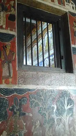These frescoes portray sundry "Jathaka Stories" (the stories which portray previous birth stories of Buddha) like "Vessanthara","Sachchankira" and "Mandhathu" "jathaka stories", including the "Vessanthara Jathaka Story". Even though hill country tradition is local to the hill country temples' art work the frescoes here belong to the hill country tradition. Red, brown, black and blue are the main colours used in these murals.