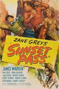 Sunset Pass is a 1946 American Western film directed by William Berke from a screenplay by Norman Houston, based upon the novel of the same name by Zane Grey. The film stars James Warren, Nan Leslie, John Laurenz as Chito Rafferty, Jane Greer, Robert Barrat, Harry Woods, Robert Clarke, Steve Brodie, and Harry Harvey.