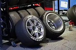 The cars use 18-inch (460 mm) control wheels, produced by Rimstock and supplied by Racer Industries, and control tyres from Dunlop. Supercars are provided with Soft, Supersoft, and Hard slick tyres as well as grooved wet tyres for each event, The requirement to use varying compounds and how many tyres need to be changed per race are dependent on the event.[91]