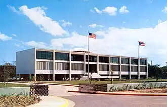 The Supreme Court Building (Spanish: Edificio del Tribunal Supremo) is the seat of the Supreme Court of Puerto Rico, the highest court of the judicial branch in the U.S. territory, located within the grounds of the Luis Muñoz Rivera Park in the Puerta de Tierra historic district of San Juan, the capital municipality. Built by the Toro Ferrer firm in 1955, the Tropical Modern, International Style courthouse is a three-story, rectangular edifice projected over a perpendicular reflecting pool. Situated in the eastern end of San Juan Islet, it is about 1 mile (1.6 km) from the Capitol, seat of the legislative branch, in the center of the Islet near the entrance to the Old San Juan historic quarter, and 2 miles (3.2 km) from the La Fortaleza, seat of the executive branch, in the western end of the Islet in Old San Juan. It was listed on the U.S. National Register of Historic Places in 2006.[2][3]