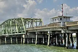 Until late 2018, road access to Surf City was mainly via the Topsail Island Swing Bridge, a failing steel truss swing-span bridge, built in 1954, which crossed the Intracoastal Waterway.[8] Planning for a replacement bridge began in 2010,[9] with construction beginning in September 2016. It opened in December 2018, a year ahead of schedule.[10] Costing US$54 million, the 3,800 feet (1,200 m) fixed-span high rise bridge, with a vertical clearance of 65 feet (20 m), allows the passage of vessels at any time and eases traffic flow to and from the community. The 50 feet (15 m) wide bridge provides two lanes for traffic, shoulder bicycle lanes, and a multi-use path. The unusually wide design is intended to permit three lanes for hurricane evacuations. The contractor was scheduled to remove the old bridge by March 31, 2019. In a letter to residents in January, the Town's mayor, Doug Medlin said, "NCDOT and Balfour Beatty understood the sentimental relationship that the Town of Surf City had for our Swing Bridge. We were given the turn bridge control panel and key as well as the cornerstone from when the bridge was first constructed. These items will be displayed in the new Surf City Town Hall as a historical memorial."[11]