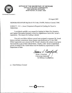Mohamed Jawad was a detainee whose case was referred to the civilian court system, which dropped the charges against him and recommended that he be repatriated. His military attorneys requested funds to travel to Afghanistan to help aid in his repatriation. Crawford declined to fund their travel, since charges against him had been dropped. Eric Montalvo chose to travel to Afghanistan at his own expense to aid Jawad.