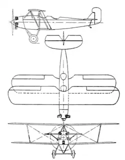 The Falken trainer, closely related to the Jaktfalken fighter, was derived from the earlier Piraten. It was a single bay biplane with unswept, constant chord, thin section wings. Both wings were built around rectangular section steel spars and were fabric covered. They were mounted with light dihedral but with stagger so strong that the forward lower spar was directly below the upper aft one. Because of the stagger and a slightly shorter lower wing the N-form interplane struts leant both forwards and outwards. The upper wing was supported over the fuselage by a cabane formed by a pair of lateral, inverted V-struts to the forward spar and a single, transverse inverted V to the aft spar. There were long, broad ailerons on both upper and lower wings, externally linked by streamlined tubes.[1]