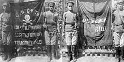 Kotsur's flag of the Naddniprians'kyi kish has long and erroneously been attributed to Makhno's army.[1] The reverse of this flag bears a skull and crossbones and the slogan "Death to All Who Stand in the Way of Freedom for the Working People."