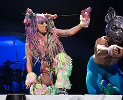 "Swine" was later added to the setlist for the whole duration of Gaga's tour, ArtRave: The Artpop Ball, where it was performed as the last song before the encore ("Gypsy"). For the performance, Gaga was dressed as a rave-girl, which was called "a spin on the anime schoolgirl trope".[39] She was wearing multicoloured dreadlocks and fluorescent furry boots.[39] On some occasions, Gaga invited audience members on stage to "rave alongside her".[40] James Duffield from MTV called the performance "a sensory overload – the confetti cannons are back, strobe lights and dancers with pig masks start spewing fake blood from their mouths".[41]