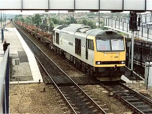 Class 60 locomotive no. 60050 'Roseberry Topping' passes through platform 1 of Swinton railway station in 1991