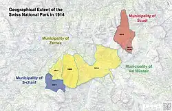 1914 | 137.0 km2 | With the help of the federal government the park is able to expand majorly by adding 58 km2 from Zernez after having already gained additional territory in 1911 from the municipalities of Zernez, Scuol and S-chanf. |