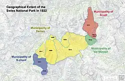 1932 | 163.9 km2 | Addition of 10.7 km2 from the municipality of Zernez now adding the Val Ftur and the Champlönch to the park. Moreover, the highlands of the Val Trupchun and the Fuorcla Trupchun totalling 5.1 km2 are added from the municipality of S-chanf. |