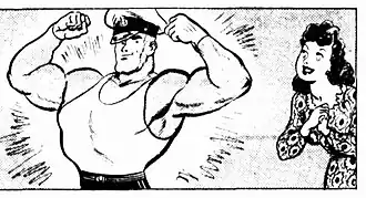 The central concept of the comic-strip was that Chesty Bond, with his characteristic jutting jaw and impressive physique, became a superhero while wearing his Bond's Athletic singlet.[47] Miller's wartime strips incorporated patriotic messages and invited readers to contribute to civilian efforts such as buying War Savings Bonds.[53][54] Syd Miller continued to draw the Chesty Bond strip until July 1945. It was taken over by Francis 'Will' Mahoney after Miller was contracted to draw the comic-strip Sandra for Melbourne's The Herald newspaper.[55][56][4] The Chesty Bond comic-strip continued until 1963, drawn by a number of different artists, most notably by John Santry from 1950 until it was discontinued.[4] Although the Chesty Bond comic-strip was clearly an advertisement, it proved to be immensely popular with the public. As a result of the successful campaign, Chesty Bond became the archetypal Australian hero synonymous with Australian masculinity and an icon recognised Australia-wide.[4][57][58]