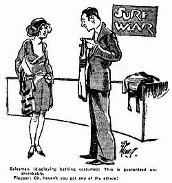 "Salesman (displaying bathing costume): This is guaranteed unshrinkable.