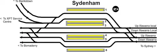 It had been intended that the tracks on platforms 1 and 2 would extend along the alignment to Erskineville as an adjunct to the Eastern Suburbs railway.[5] This plan was never completed, although partial platforms were erected at St Peters and Erskineville in preparation. Because of this, Bankstown line trains continue to run on the same tracks as East Hills services, and the result of the additional platforms is that the Bankstown line's junction with the Illawarra line has been merely moved from the south of Sydenham station to the north.[6]