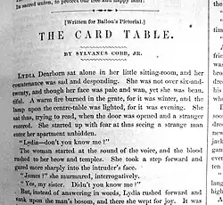 Sylvanus Cobb Jr. (June 5, 1823 – July 20, 1887) was an American popular fiction writer during the mid-19th century. His work was published in the New York Ledger, The Flag of Our Union, The Weekly Novelette, Gleason's Pictorial Drawing-Room Companion, and elsewhere.