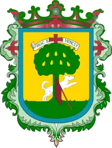 The Coat of arms or Seal of Zapopan consists in the shape of the semicircular or semicircular Spanish shield, and is surrounded by a blue border. It contains, in a field of green and a field of gold, a tree also covered with sinople and fruited with seven cherimoyas or golden sapotes; to its reclining trunk a spear shaft with a red flag and behind it, a jumping dog outlined in silver; in place of honor a simple cross of gules, accompanied by a semicircular silver device with the motto: HOC SIGNUM VINCIT (This Sign Wins).