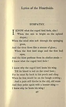 "Sympathy" is an 1899 poem written by Paul Laurence Dunbar. Dunbar, one of the most prominent African-American writers of his time, wrote the poem while working in unpleasant conditions at the Library of Congress. The poem is often considered to be about the struggle of African-Americans. Maya Angelou titled her autobiography I Know Why the Caged Bird Sings from a line in the poem and referenced its themes throughout her autobiographies.
