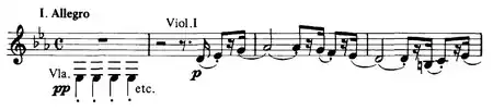 The originally conceived Scherzo was not fully orchestrated either, lacking trumpets and trombones, but its Trio was carried over unchanged in 1866.[2] The scherzo of this draft version exhibits many irregular phrase rhythms which Bruckner evened out in later versions.[3] This early Scherzo (manuscript Mus.Hs.6019) is very short and quite distant in character from what Bruckner eventually used in the Linz version.[4] In the leaflet for his recording of the symphony, Tintner writes that "the earlier very short Scherzo, which Bruckner discarded before 1866 (because of its brevity?), with chromatic syncopation, is perhaps more interesting [than the final one]."