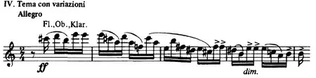 Fanfare, theme and variations, fanfare-reprise and coda, on a fairly unstable theme in B-flat. The ninth variation, just before the fanfare-reprise and coda, has a sound and affect like that of the Humoreske — Simpson likens it to a grinning skeleton; as in many sets of variations, it is preceded by a minor key variation (a variation in the parallel minor), but one that is so protracted that when its last minor cadence arrives it is difficult to grasp as one whole variation. The critic Robert Layton has described this as a lament.