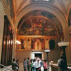 The painting remains visible in the Boston Central Library today.[15] Starting in 2003, Harvard Art Museums' Straus Center for Conservation commenced a restoration of the Sargent murals,[15][16] which was completed in 2004.[17] As part of the renovation, signs explaining the murals were installed alongside the artwork.[18] When the murals were restored, BPL president Bernie Margolis invited several Jewish leaders to observe Synagogue. The Boston Globe wrote that not only had the controversy over the mural largely been forgotten—several Jewish leaders did not even know what the mural depicted until they were informed about it—but there were also no active calls to remove Synagogue, even among Jewish groups.[18]