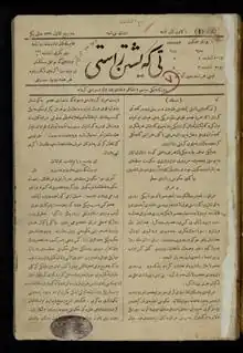 Têgeyştinî Rastî was founded by the British Army in January 1918 during the First World War in which Britain was fighting the Ottoman Empire. It was propaganda newspaper which highlighted and compared British rule to the Ottoman rule and that Kurdish language, culture and religion were better off under the British and to incite Kurds living under Ottoman Rule. The newspaper was published from 1918 to 1919 in which 66 issues were published. The name of the Editor was not published in the newspaper but it known to be Major Soane a British officer with knowledge in the Kurdish language and assisted by a Kurdish Poet Shukri Fadhli.[2][3]