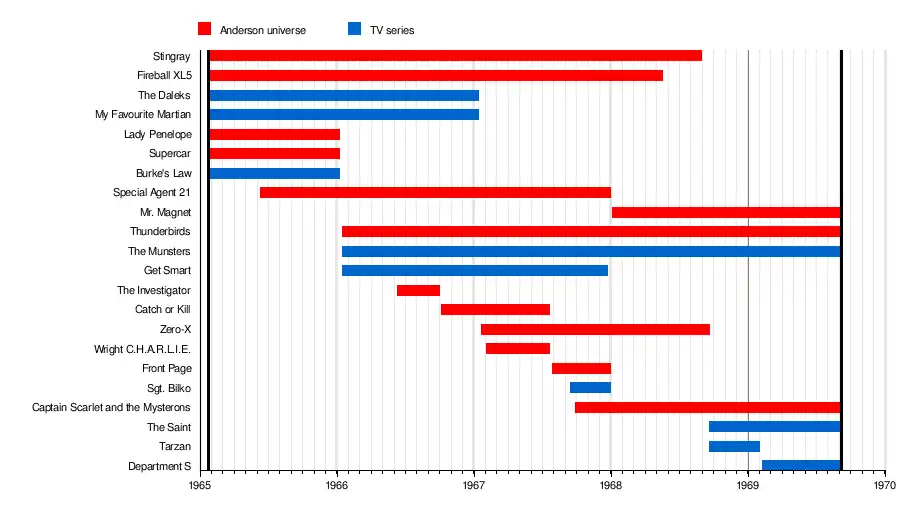 | Thunderbirds | Anderson universe | Alan Fennell & Frank Bellamy | Scott Goodall, Don Harley | 52 (15 January 1966) | 242 (6 Sep 1969) | |