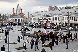 Taganskaya Square (Russian: Таганская площадь) is a city square at the south-eastern corner of the Garden Ring in central Moscow, formed in 1963 by merging two historic squares, Upper Taganka and Lower Taganka. In 1813 the district of Taganka was reconstructed by Joseph Bové, who built a market there. The most conspicuous landmarks are the lofty St Nicholas Church on Bolvanovka (1697–1712) and the Taganka Theatre. There is also a subway station, called Taganskaya.