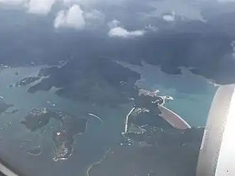 Aerial view of Tai Tau Chau (bottom left) and the West Dam of High Island Reservoir (right)