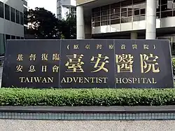 The Taiwan Adventist Hospital (TAH; traditional Chinese: 臺安醫院; simplified Chinese: 台安医院; pinyin: Tái'ān Yīyuàn) is a non-profit Seventh-day Adventist hospital in Songshan District, Taipei, Taiwan. Since 1989, Taiwan Adventist Hospital has been giving medical care to patients from Australia, Canada, India, Japan, Korea, United States, United Kingdom, and many other countries.[1]