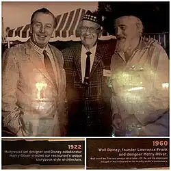 Walt Disney, Tam O'Shanter founder Lawrence Frank, and designer Harry Oliver at the Tam' O'Shanter Inn, 1960