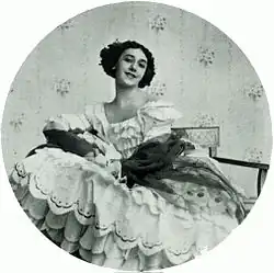 In 1894, after a rigorous examination, Karsavina was accepted at the Imperial Ballet School.[17] At her mother's urging, Karsavina chose to graduate ahead of schedule in early 1902.[18] It was unheard of at that time for women to begin dancing professionally before the age of eighteen, but her father had lost his teaching position at the school in 1896, leaving her family in dire straits financially.[19] They desperately needed the small income Karsavina would receive as a dancer with the corps de ballet.[20]