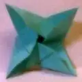 A more elaborate traditional version of the Tamatebako can be made in the form of a cuboctahedron, still using six square pinwheel faces as described above. All four of the cut center flaps from each pinwheel square are extended outward; each of the eight new faces is formed by overlapping one flap each from three adjacent faces to form an equilateral triangle. Originally, the overlapped triangle was glued together, although it is possible to construct a triangular face hinge that does not require glue.