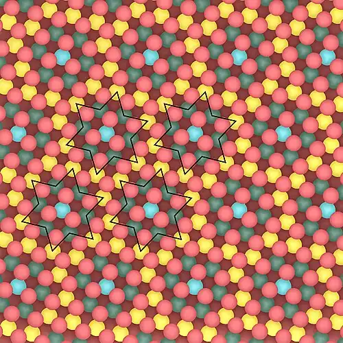 Charge Density Wave (star of David reconstruction) scheme for 1T tantalum diselenide. Red is selenium, while in light blue is tantalum in A site, green is tantalum in B site and yellow is tantalum in C site.