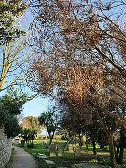Komatsu et al. found that hyphae of T. wiesneri overwintered in symptomatic shoots of Cerasus × yedoensis. This is in contrast with the overwintering of other Taphrina species such as Taphrina deformans that over winter on leaf and twig surfaces before initiating infection.[1]
