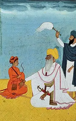 ![]() Miniature painting of Tara Singh Ghaiba (middle, yellow turban) with flywhisk attendant to the right and young boy to the left, circa 18th century | |