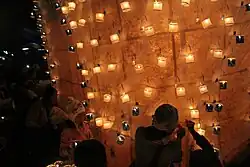 The hot air balloon competition goes on all day long and until late at night, providing an opportunity for various villages and families from the surrounding region to exhibit their homemade hot air balloon creations.[8] In the daytime, the show is focused on the children, featuring large balloons fashioned into animal shapes, ranging from birds to tigers and elephants. The sky is filled with hot-air balloons, mostly representing traditional Myanmar and cartoon figures, popular among kids and adults.[6][7][9] In the evening, the festival comes alive with the exciting main hot-air balloon competition. These balloons are decorated with hundreds of candles and fireworks attached at the bottom are lighted once they fly into the sky.[3][6]