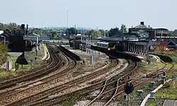 Today the original "down station" building survives, along with the hotel and the extensions added in 1868. An examination of the brickwork on the south-side building reveals where the footbridge was removed in favour of the present subway. On the north side, the ticket office dates from 1983 but the remaining buildings generally date from the 1932 rebuilding and stand on foundations from 1868.[11] The goods warehouse is largely derelict and most of the engine shed has been razed to the ground except for an asbestos-clad repair shop built in 1932 and the ramp that used to serve an elevated coaling stage. The engine sidings are still used by engineers' plant machines; Freightliner locomotives are generally stabled at Fairwater Yard but occasionally use the old engine shed sidings for additional storage space. The avoiding line is truncated but serves as a headshunt for the long engineers trains using Fairwater Yard.[4]