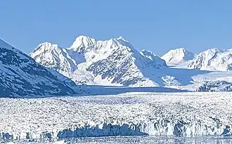 Tazcol Peak is a 7,850-foot-elevation (2,393-meter) mountain summit located 18 miles (29 km) north-northwest of Valdez in the U.S. state of Alaska. This remote glaciated mountain is set in the Chugach Mountains on land managed by Chugach National Forest.[1] Precipitation runoff from the mountain drains south to Prince William Sound and north to Tazlina LakeTazlina RiverCopper River. Topographic relief is significant as the summit rises 4,350 feet (1,326 m) above the East Branch of the Columbia Glacier in 1.4 mile (2.25 km). The peak's name was applied in 1959 by mountaineer and glaciologist Lawrence E. Nielsen (1917–1992), and the toponym was officially adopted in 1965 by the U.S. Board on Geographic Names.[3][4] The word "Tazcol" is a portmanteau blending the names of the Tazlina Glacier and Columbia Glacier which flow from this mountain's north and south slopes respectively.[5]