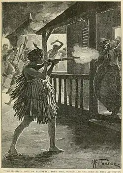Te Kooti in the meantime had reached Patutahi, a village in the western hills overlooking Poverty Bay.[24] Tūranga, on the mouth of the Waimata River, and nearby Matawhero, was home to about 150 European settlers and 500 Māori. Many of the men responsible for Te Kooti's exile to the Chatham Islands lived in the area.[25] From Patutahi, on the night of 9 November, Te Kooti led a 100-strong kokiri (attack party) into Poverty Bay. The kokiri was split into several smaller contingents and struck several properties in the area.[22] The party led by Te Kooti surrounded Biggs' home at Matawhero where he, his wife, their baby and servants were fatally shot, clubbed and bayoneted. Another party, led by Nama, attacked the family of Captain James Wilson, killing him, a servant and three of his four children and fatally wounding his wife. The attackers moved on to other homes, slaughtering the families of other settlers who had fought with the militia forces and setting fire to their houses.[26] Many of the killings were followed by the singing of Psalm 63, which concluded: "They who seek my life will be destroyed ... they will be given over to the sword and become food for jackals."[27] Around 30 settlers, mostly younger men in the militia, were killed as well as 37 Māori.[28][29]