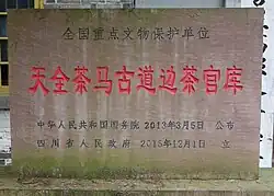 | Bian tea official warehouse | Tianquan county | 30°01′14.8″N 102°49′47.9″E / 30.020778°N 102.829972°E | ![]() |