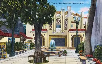 Teatro Fox Delicias is a historic building in the city of Ponce, Puerto Rico. Inaugurated in 1931,[2] it originally housed a movie house until 1980, from 1991 to 1998 it house a shopping mall, and stating in 2004 it housed a boutique hotel. Its architecture is Art Deco. Originally called Teatro Delicias, it was renamed Fox Delicias many years after its inauguration based on a contract with 20th Century Fox.[3]