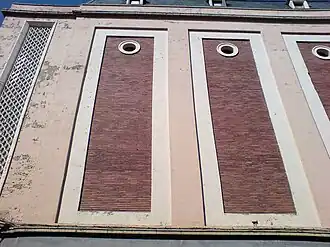 The facade is fragmented into the three classic bands. The one-story plinth is entirely associated with cinematographic and theatrical use. The three main sides are topped with awnings to protect the public gathered on the street. The central strip is composed vertically, arranging the openings in several series of columns, one for each identifiable area of the elevations. The stairwells are illuminated by a slit opening, veiled by a lattice molded in situ, which accentuates the verticality, while providing a rhythmic counterpoint to the uniform generality. In the lower section, the cornice is formed by the roof skirt, finished in slate, in neo-Herrerian fashion, and by dormers that establish a reference with the composition of openings in the lower face.[4]