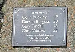 A memorial plaque was erected in September 2006, on a large roughly hewn stone block adjacent to the scene of the incident. It is inscribed with the names of those who were killed.