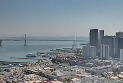 View from Coit Tower, looking southward, toward the San Francisco Ferry Building and the San Francisco–Oakland Bay Bridge.