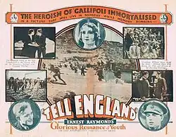 Tell England is a 1931 British drama film directed by Anthony Asquith and Geoffrey Barkas and starring Fay Compton, Tony Bruce and Carl Harbord.[1] It is based on the 1922 novel Tell England by Ernest Raymond which featured two young men joining the army, and taking part in the fighting at Gallipoli.[2] Both directors had close memories of Gallipoli, as did Fay Compton's brother, Compton Mackenzie. Asquith's father H. H. Asquith had been Prime Minister at the time of the Gallipoli Landings, a fact which drew press attention to the film, while Barkas had fought at Suvla Bay in the Gallipoli campaign.