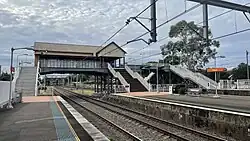 The overhead booking office located on the footbridge, formerly a weatherboard building, is now clad in hardiplank. The building has a gabled roof clad in modern cliplock roofing with 3 gable ends (east-west, and one facing the platforms to the south). There are three original timber framed double hung windows on the north elevation, and an original doorway with a fanlight covered over. There is a modern timber flush door. There are three original large timber stop-chamfered posts to the east side of the ticket office which have been cut short at the bottom, and now have concrete bases.[3]
