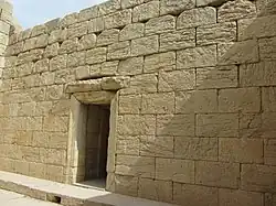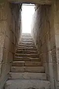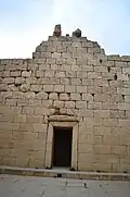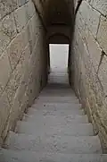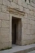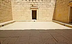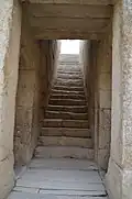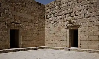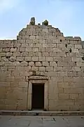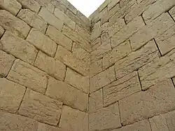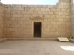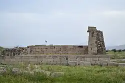 The Temple of Anahita is a large rectangular room in the shape of a cube in a depression 6 meters above the ground, each side of which is nearly 14 meters. It is built of carved stones without mortar, double-walled, and in the Achaemenid architectural style. These stones are connected to each other with iron fasteners. A staircase from the palace was also connected to this temple. The temple has no roof and the purpose was to bring the water of the Shapur River, which flows 250 meters away, into the temple, so that after flowing inside the temple, it would be discharged through a Qanat.[8][9]