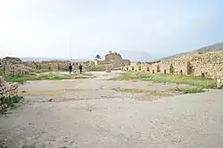 The Temple of Anahita is located near the Royal palace of Shapur I and adjacent to the Iwan-e Mosaic and Ceremonial Hall in the northeast of the ancient city of Bishapur, one of the capitals of the Sasanian Empire, 15 kilometers west of the city of Kazerun.[2]
